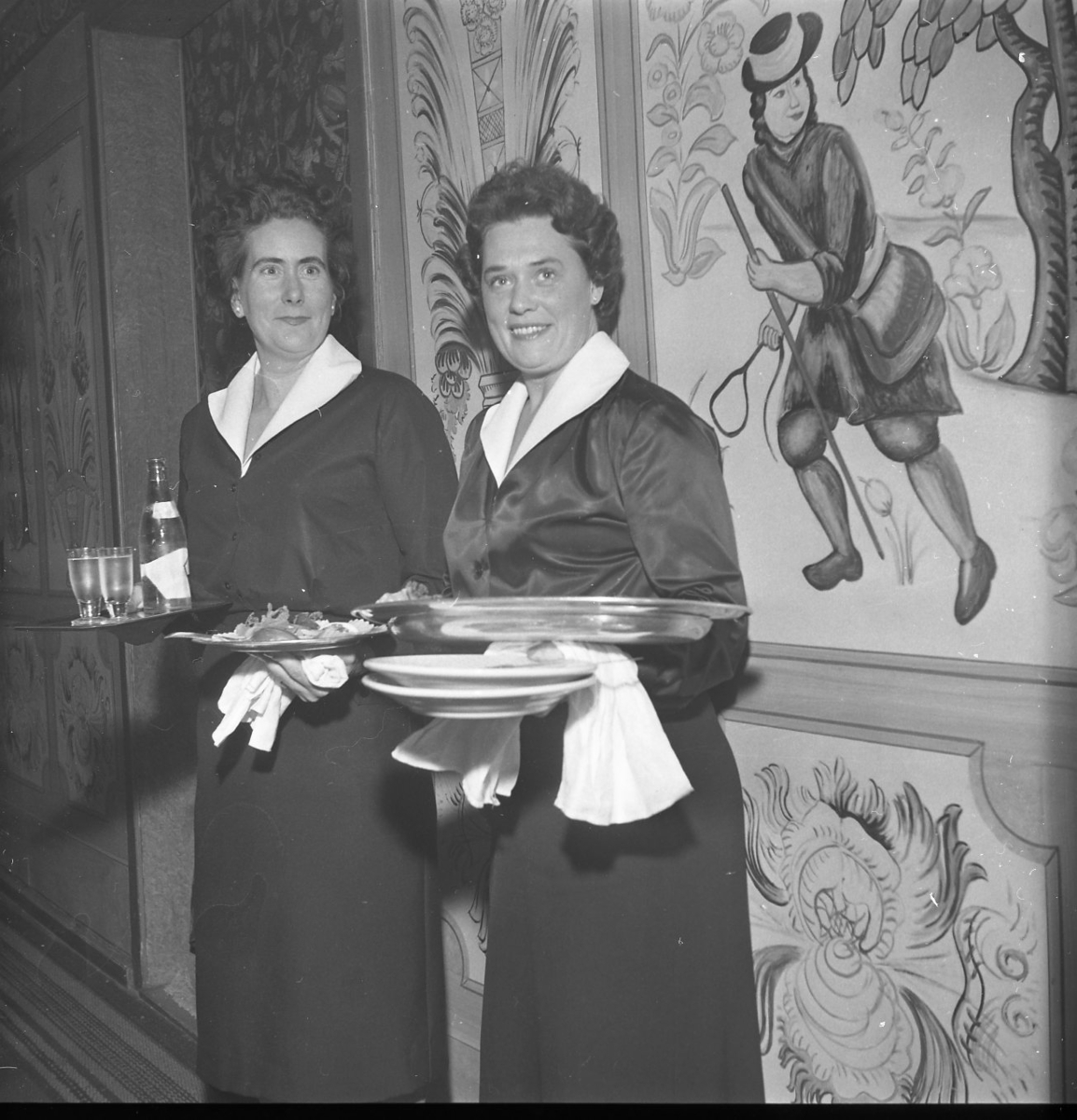 Två kvinnliga servitriser på Ribbagården. Kvinnan till vänster är Barbro Moreau.