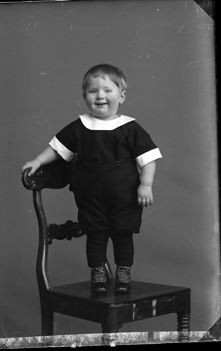 En liten barn står på en stol. Gossen Johansson i Gränna.
