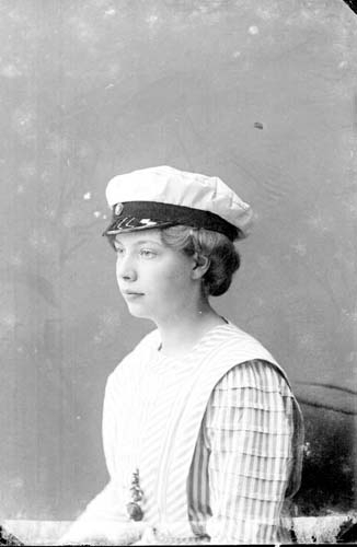 Bröstbild, 3/4-profil av en ung kvinna med studentmössa.