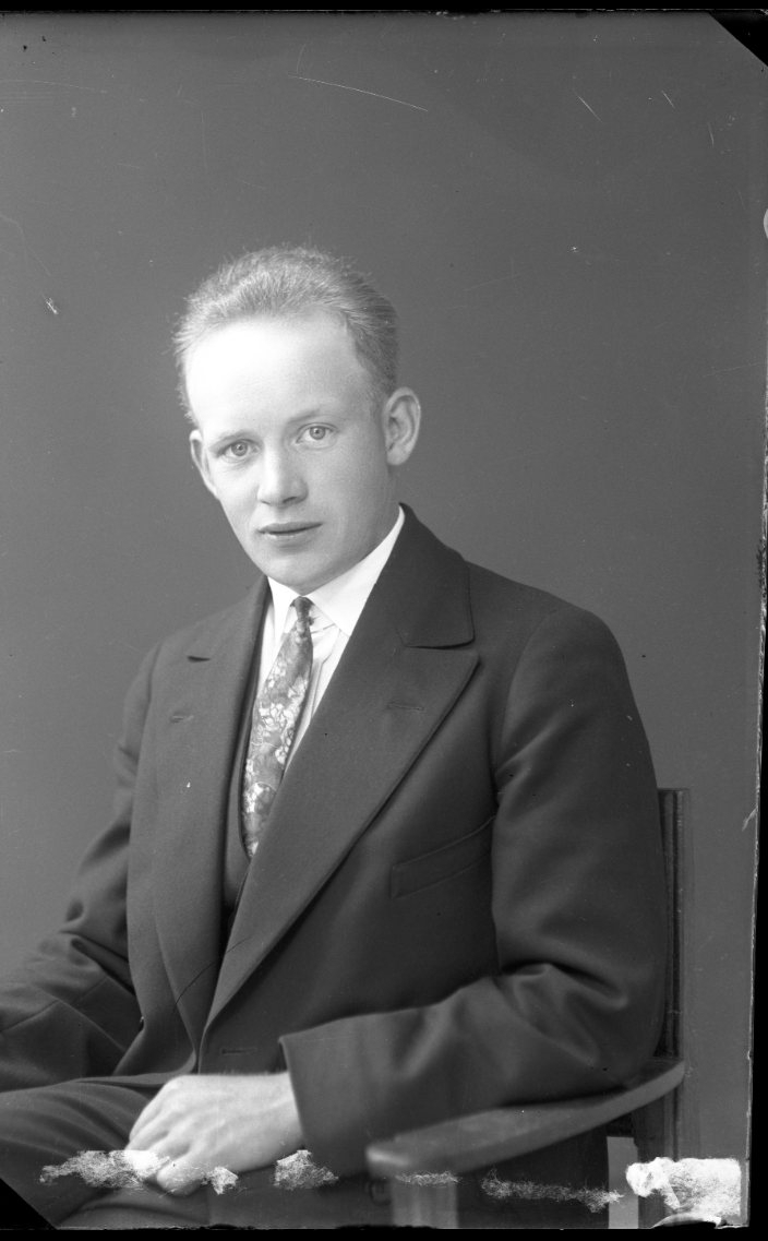 Porträtt av en sittande ung man i kostym och slips.