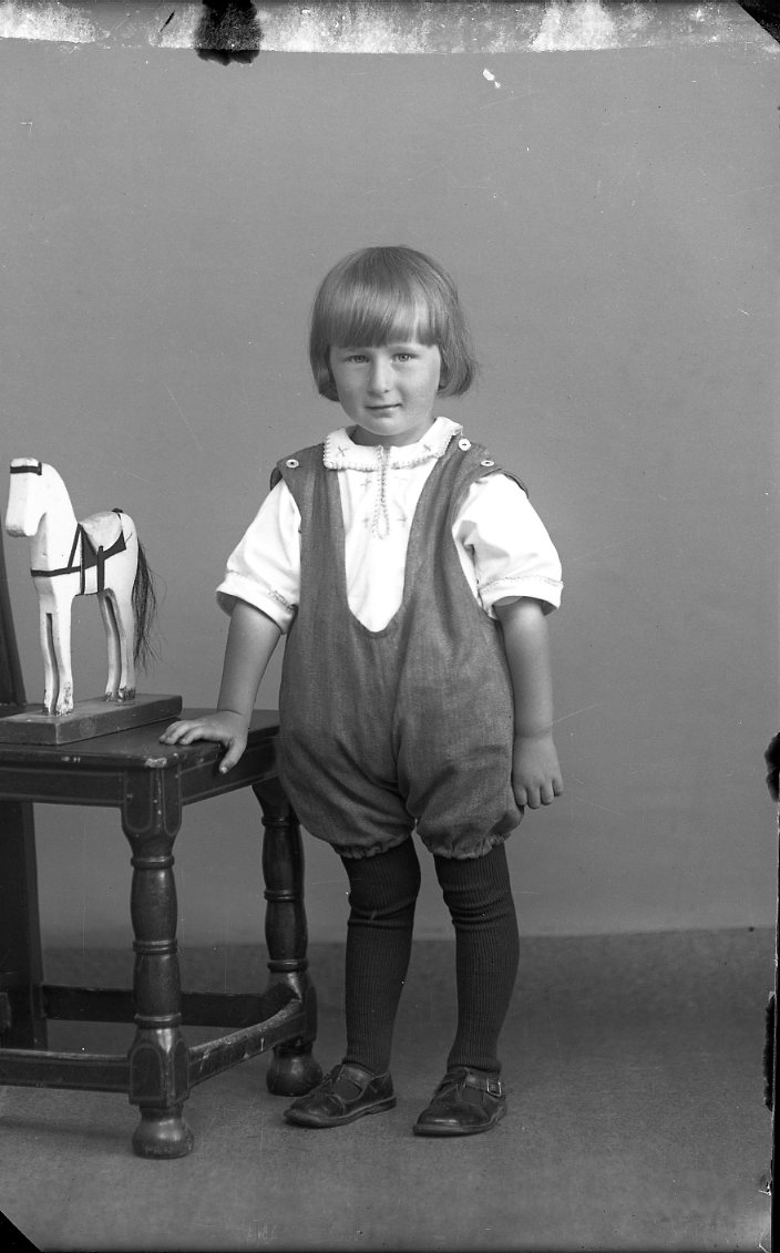 Porträtt av en "gossen Blom" från Västanå. Han står bredvid en stol med en leksakshäst.