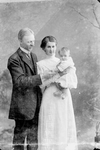 Grupporträtt med man, kvinna och spädbarn. Kvinnan håller barnet i famnen.