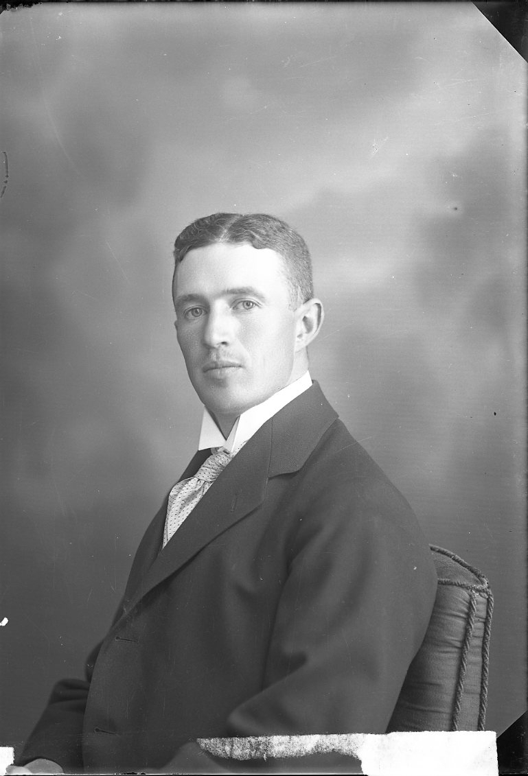 Porträtt av en man, sitter i profil och vänder sig mot fotografen..