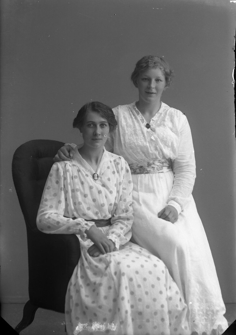 Gruppbild med två unga kvinnor. En sitter i en fåtölj och den andra sitter på vänstra armstödet. De bär en tunn ljus prickig klänning respektiv tunn ljus med broderi på bröstet. En av dem är Maja Johansson på Ribbagården i Gränna.