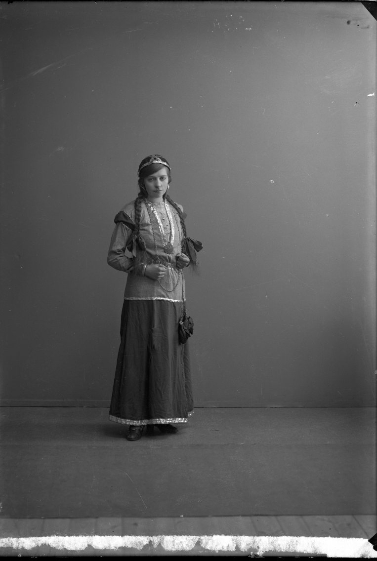 Porträtt av en flicka med långa flätor, i något fornnordisk klädsel.