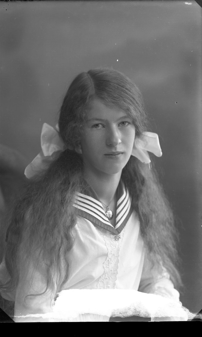 En flicka i ljus klänning med sjömanskrage och ljusa rosetter i håret.