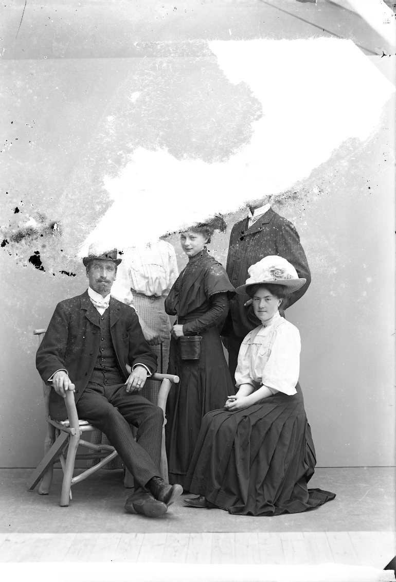 Gruppbild med tre kvinnor med hattar och två män med hattar. En av männen är Malte Olandersson från Tenhult.