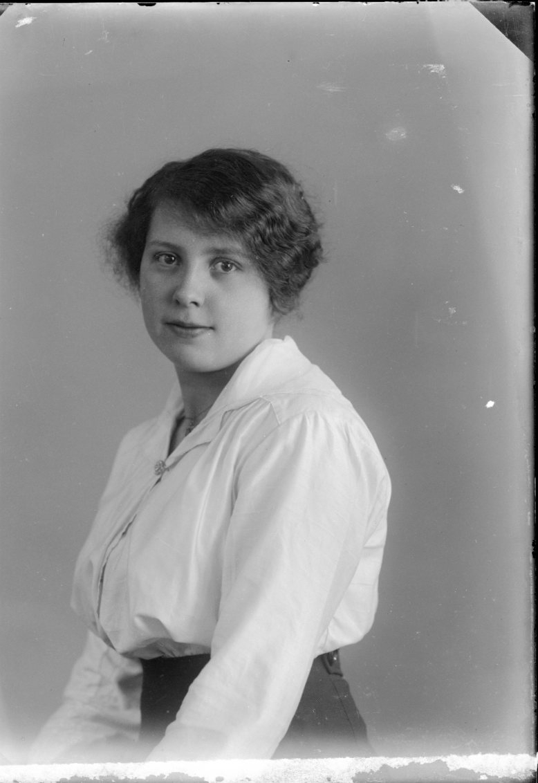 Bröstbild av en ung kvinna, hon står i profil och vänder ansiktet mot fotografen.