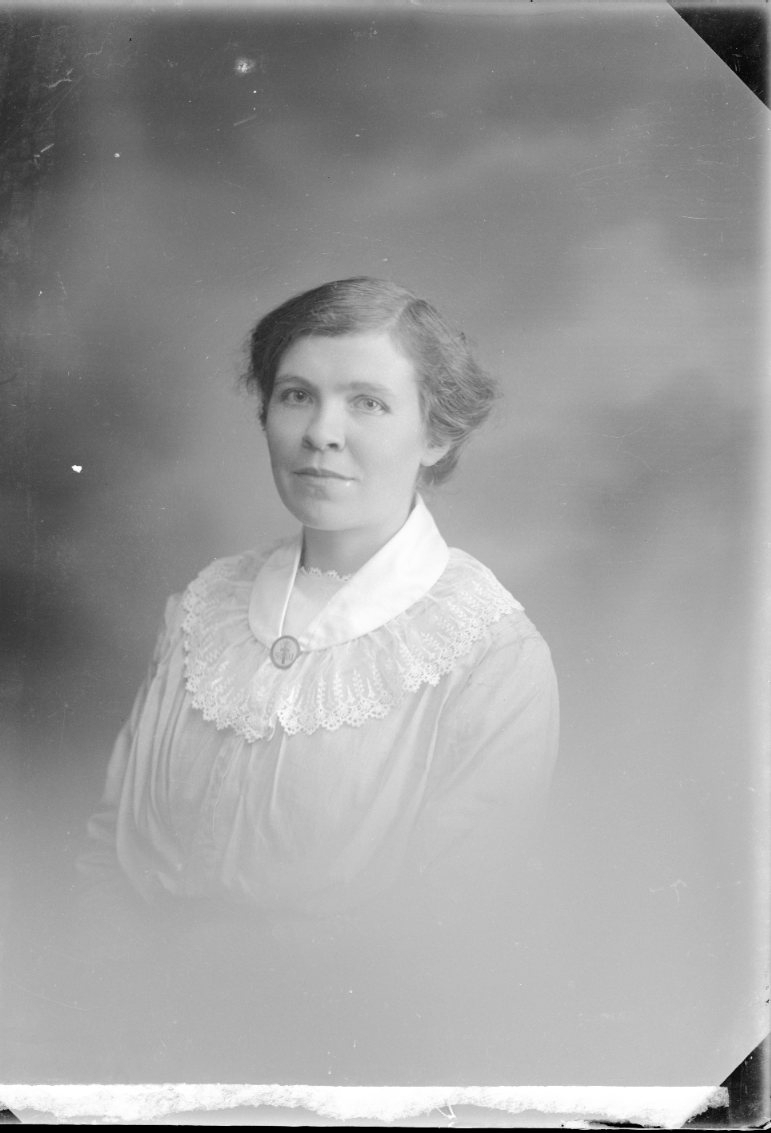 Porträtt av en kvinna i ljus blus med spetskrage.