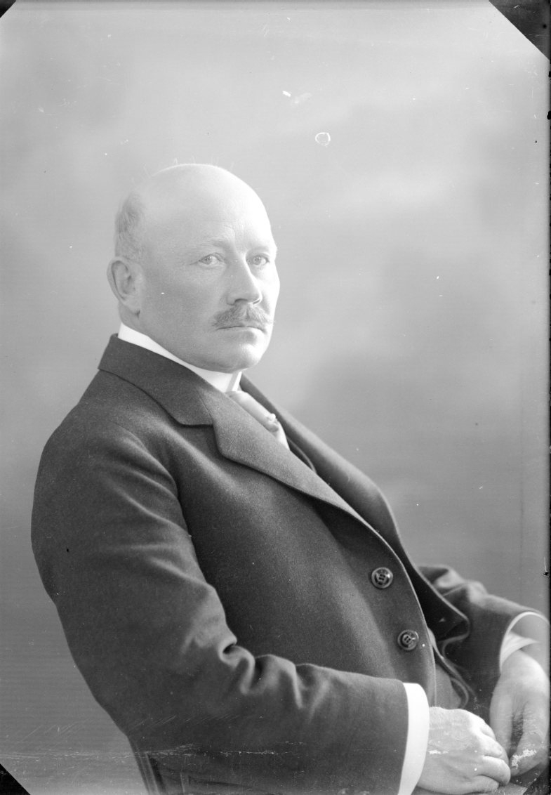 Bröstbild av en tunnhårig man med mustasch. Han sitter i profil men vänder ansiktet mot fotografen.