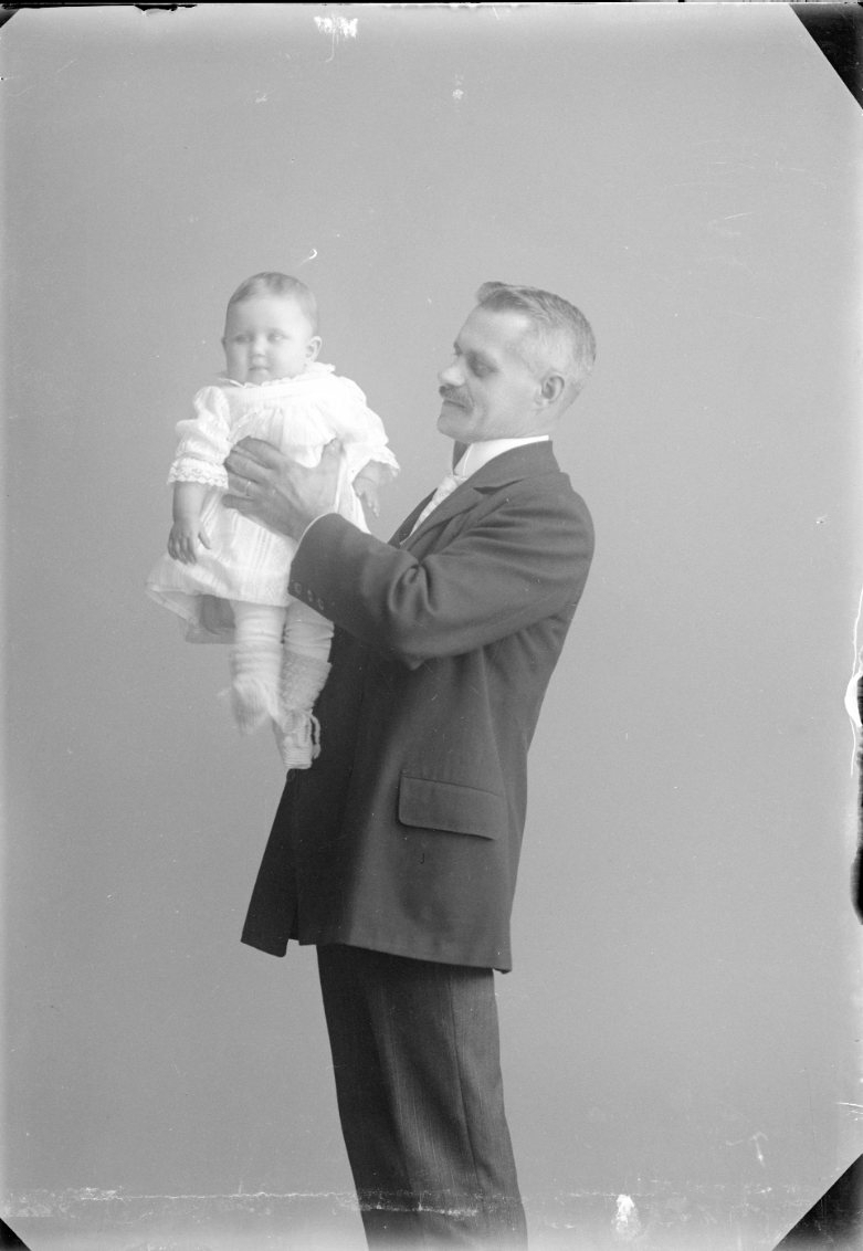 En man med mustasch håller upp ett spädbarn i luften.