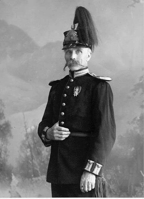 Porträtt av fanjukare Lundin med bred spetsig mustasch, i uniform.