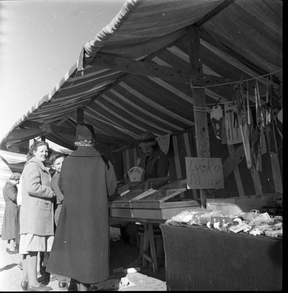 Två kvinnor och en pojke står och handlargodis i ett marknadsstånd. Kvinnan bakom disken väger godiset på en våg.