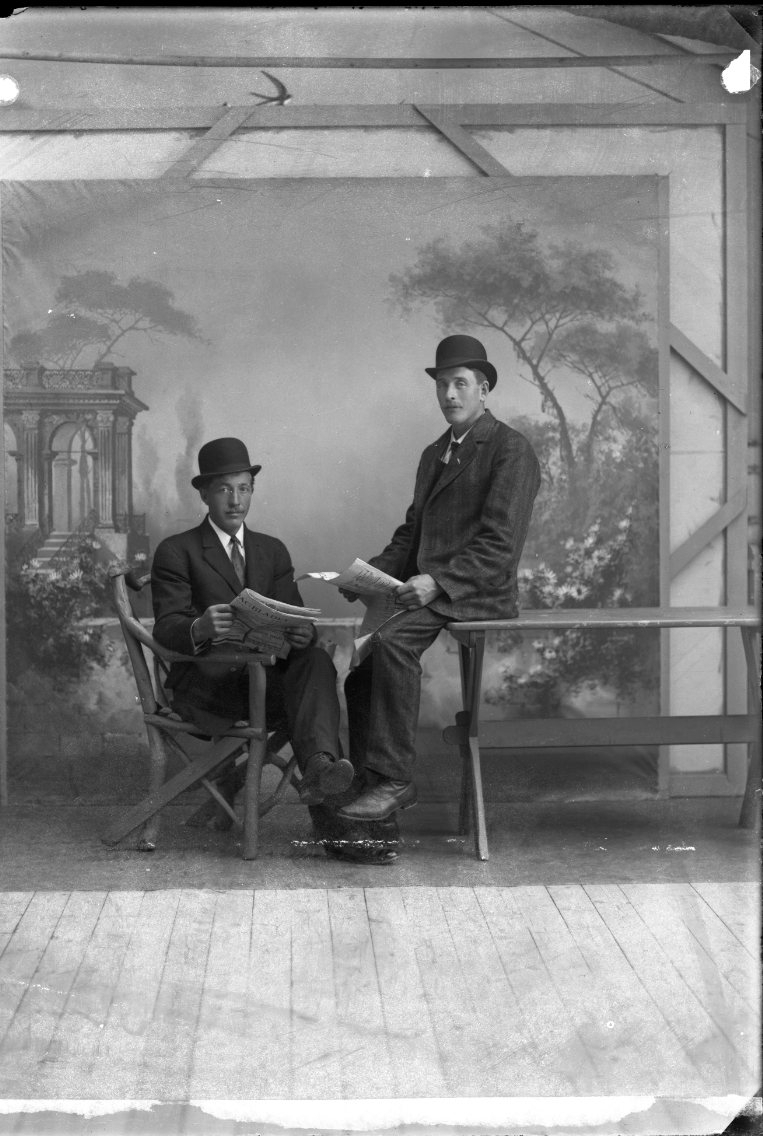 Två unga män med kubbhatt vid enkla möbler och tidning i händerna. En sitter på en stol och den andra på ett bord.