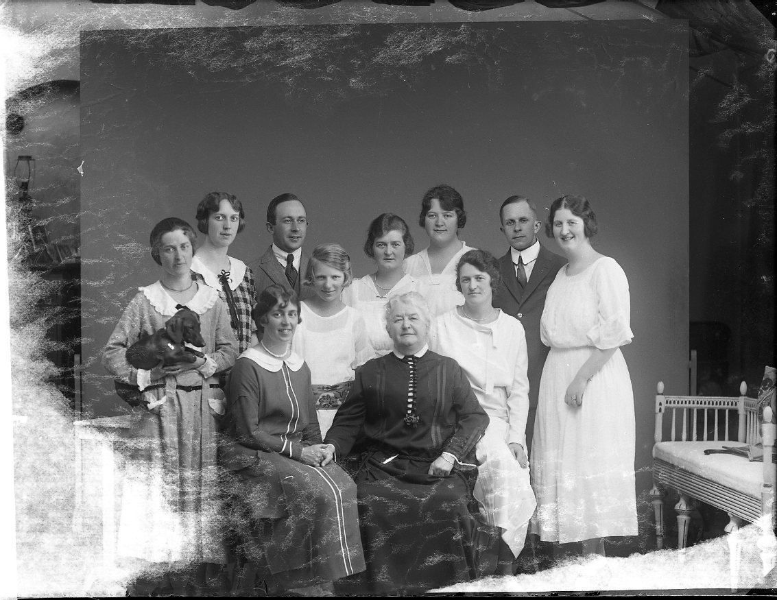 Troligen en släkt/familjegrupp - familjen Lindholmer. En kvinna till vänster har en tax i famnen. Den äldre kvinnan är Svea Lindholmer och hennes döttrar står bakom henne.