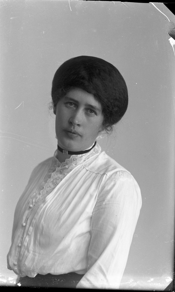 Porträtt av en ung kvinna med en rund hatt på huvudet.