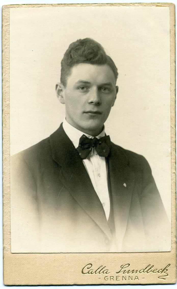 Kabinettsfotografi: porträtt av okänd ung man. Klädd i kostym med prickig fluga i halsen.