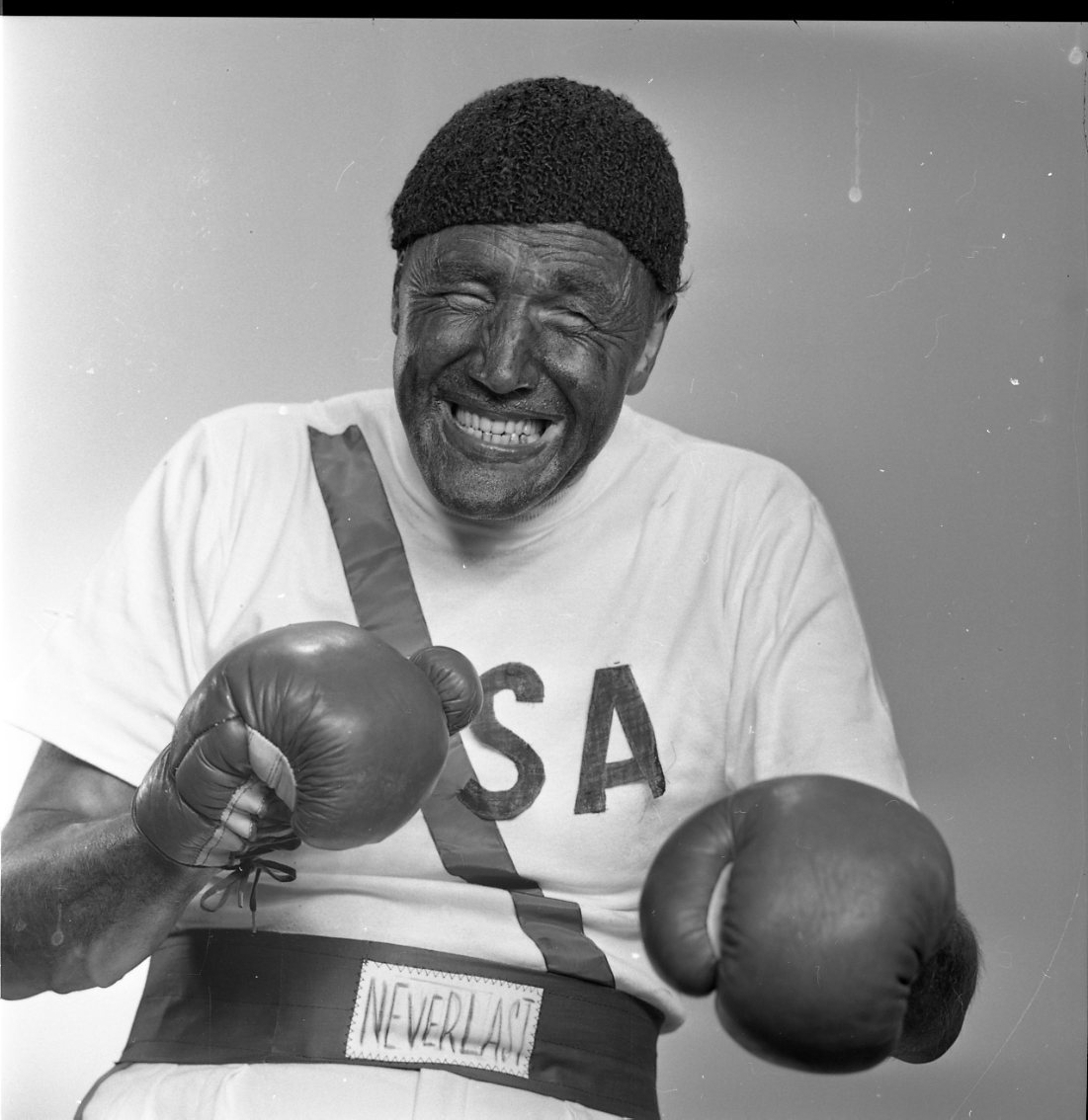 En man med mörkt sminkat ansikte, svart peruk, boxarhandskar och en t-shirt märkt "USA". Han agerar boxaren Floyd Patterson.