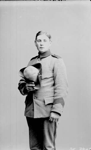 Porträtt av en ung man, beväring i uniform. Han håller en trekantshatt i handen.