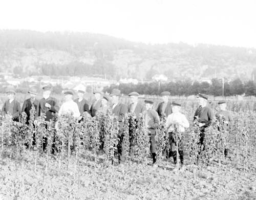 Två äldre män och en grupp ungdomar bland trädplantor på ett gärde mellan Gränna stad och Vättern. De äldre männen är Sven Landström och Carl August Johansson