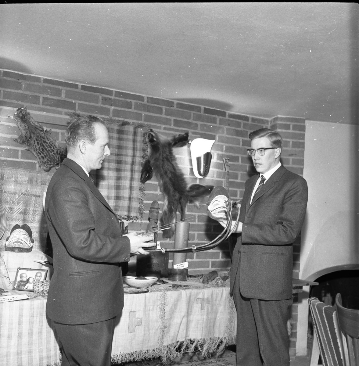 Två män står framför ett långbord. På bordet ligger flera föremål bland annat flätade korgar och masker. På väggen bakom bordet hänger textilier och djurskin. Karl Midnäs står och håller i en mask.
