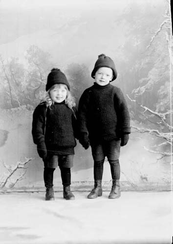 Grupporträtt med två små pojkar i stickade tröjor, mössa och vantar. De håller varandra i handen och står framför scenografi med vinterlandskap.