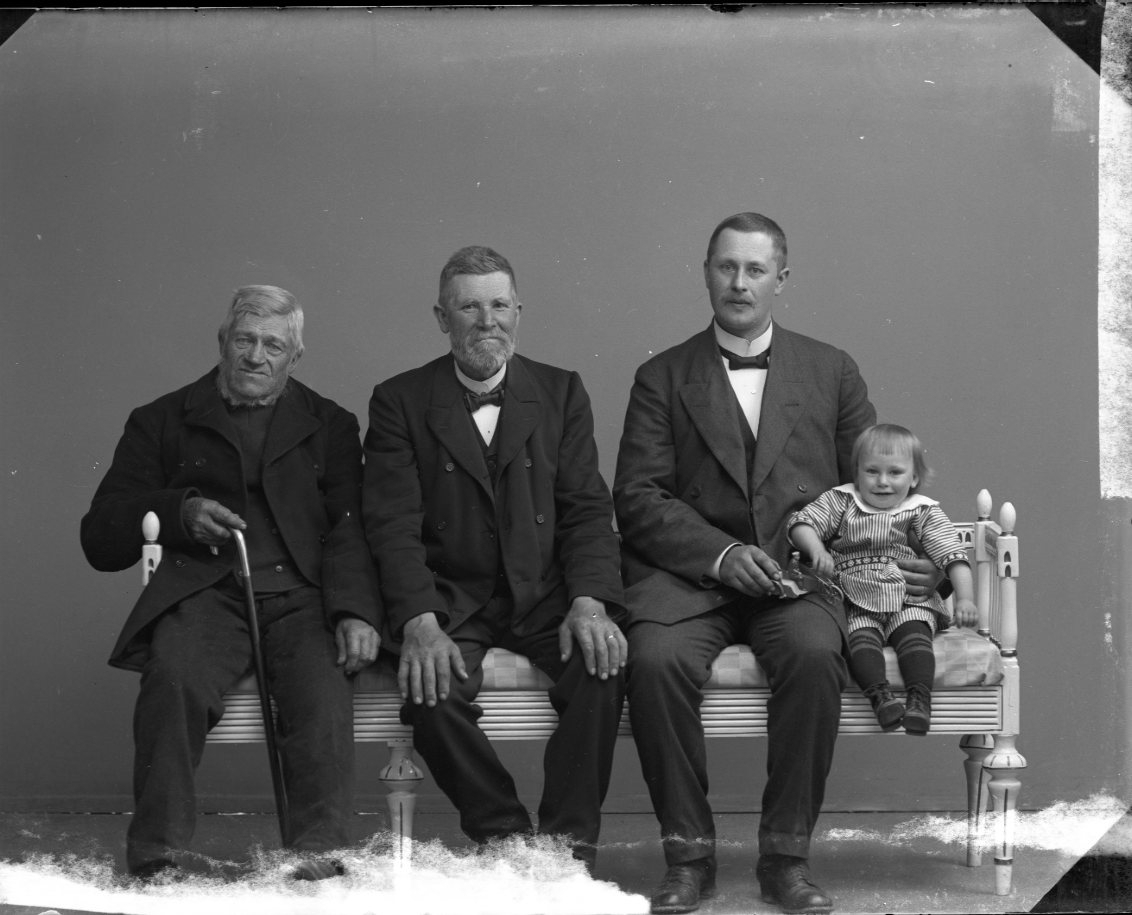 Gruppbild med tre män i olika åldrar samt ett litet. Fyra generationer? De sitter på en soffa.