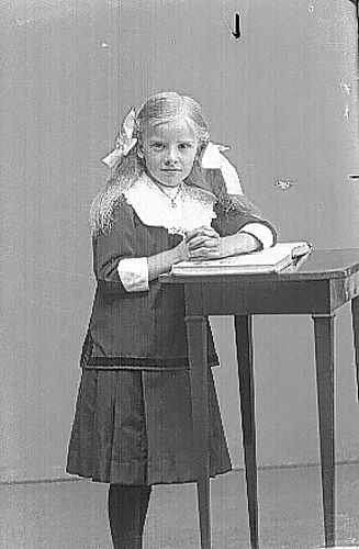 Aina Larsson, en liten flicka i kjol, med rosetter i håret stående lutad mot en pulpet med en uppslagen bok.