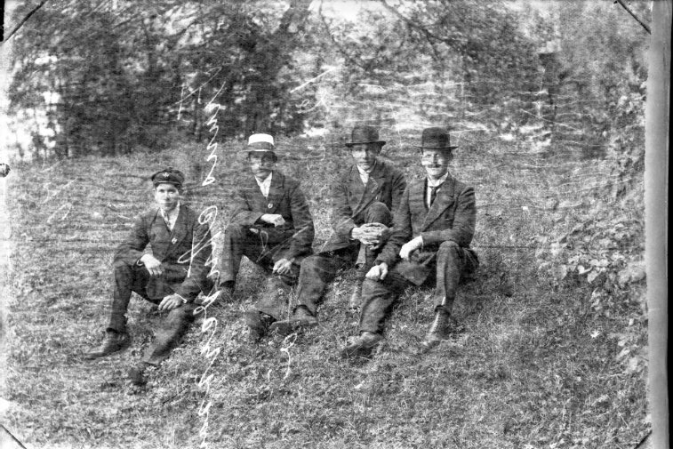 Fyra män sitter på en grässlänt. Troligen Visingsborgs slottsruin i bakgrunden.