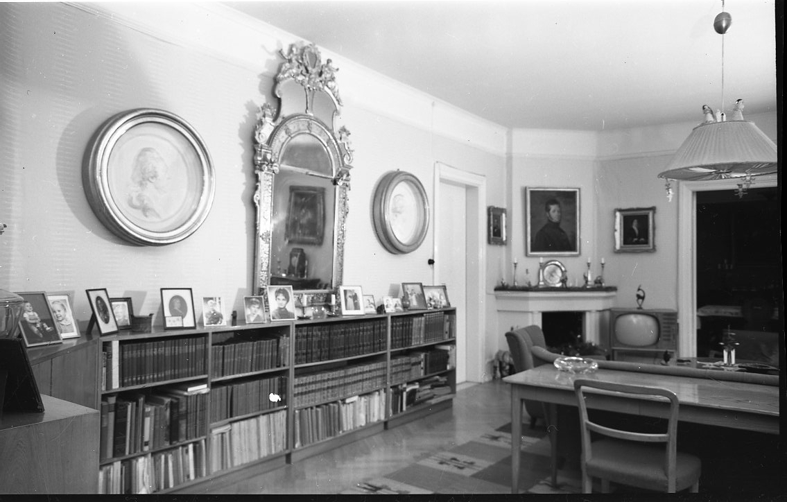 Interiör från familjen Nordenankars hem i Gränna. En låg bokhylla med ramade fotografier. Stor väggspegel flankerade av porträttreliefer.