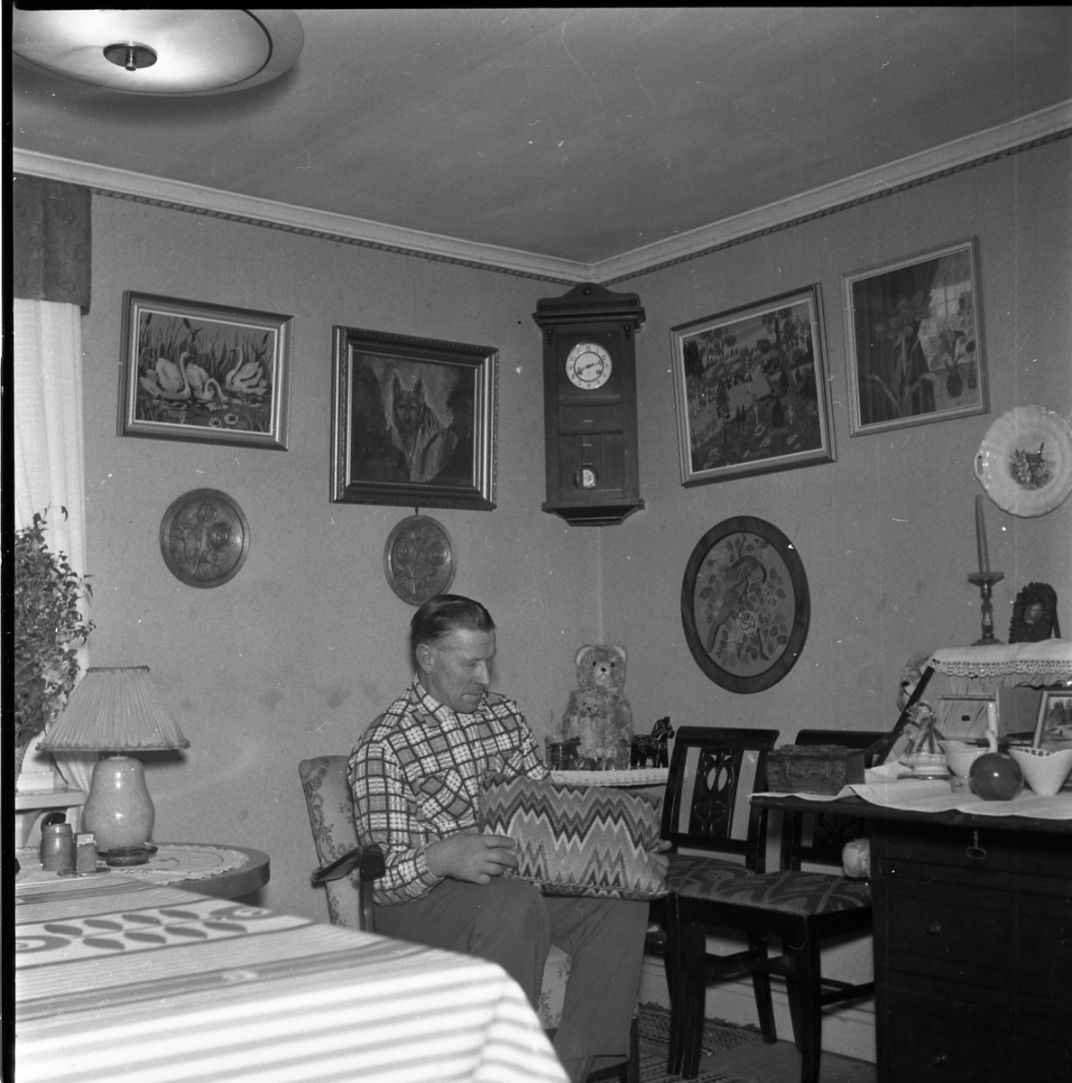 Porträtt av en man sittandes i en fotölj. Han håller i en kudde. På väggarna hänger tavlor och ett väggur.