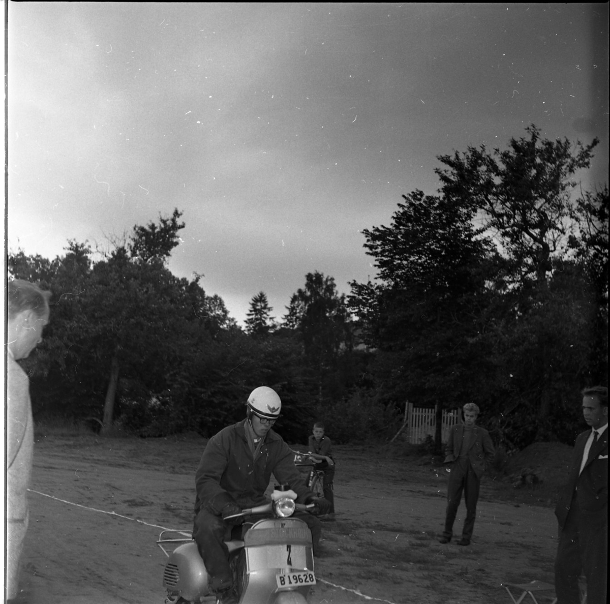 En förare på sin vespa åker på en bana. En liten publik står och tittar på honom.