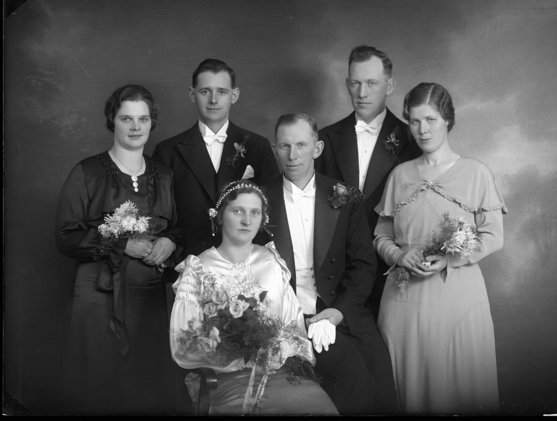 Brudparet Axel Johansson och Annie Svensson med två tärnor och två marskalkar som flankerar brudparet.