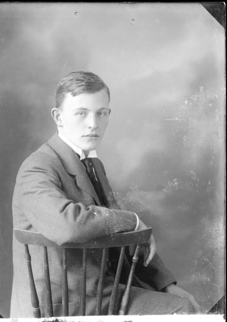 Porträtt av en ung man som sitter på snedden på en pinnstol.