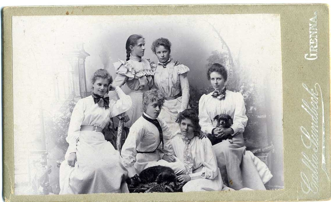 En grupp med sex unga kvinnor. En hund ligger på en pall framför dem och en annan ligger i knät på en kvinna.