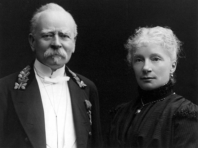 Gruppbild med Victor Egnell och hans hustru Anna Hård af Segerstad. Victor är klädd i sin borgmästaruniform. De firar silverbröllopsdag.