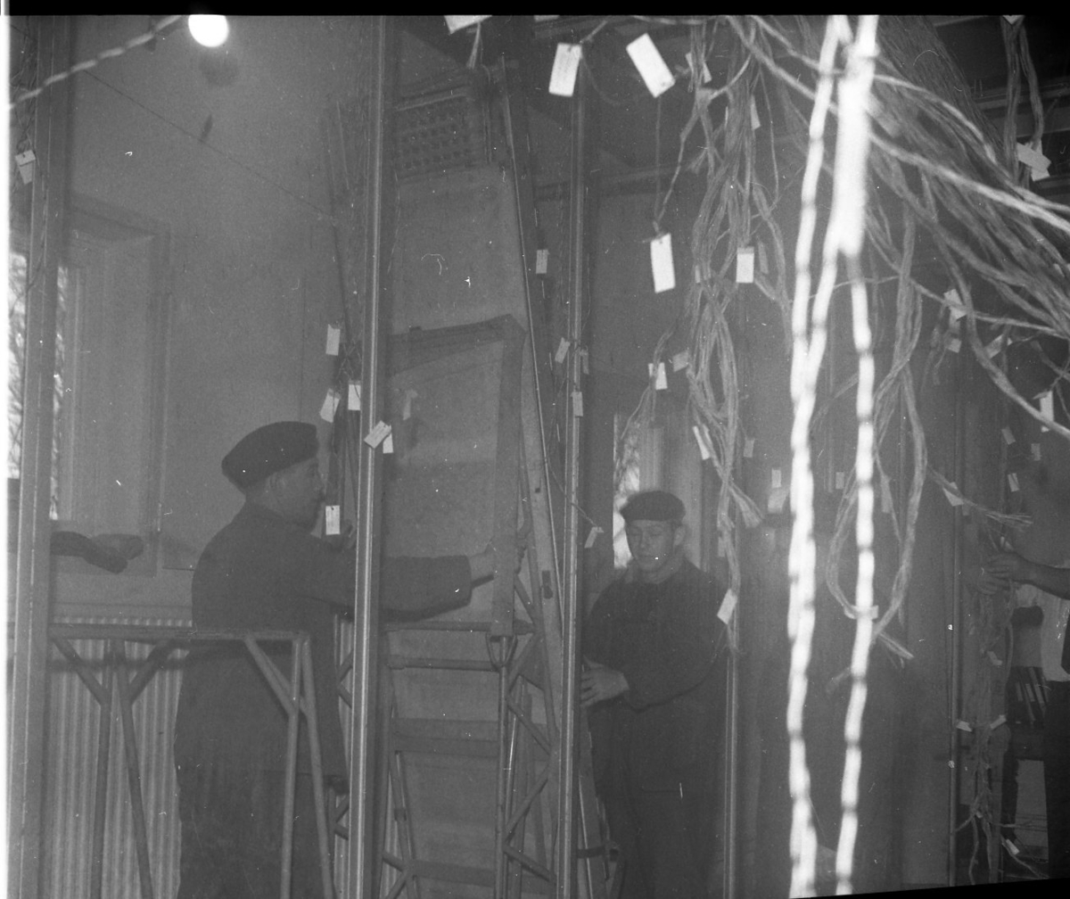 Två televerksmontörer arbetar troligen med att installera ett riktväljarstativ i televerkets nya byggnad i Gränna.