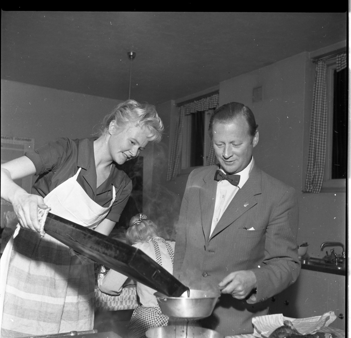 En man i kostym och fluga håller ett durkslag när en kvinna med förkläde häller av steksky från en ugnsplåt. Bakom dem sitter en kvinna vid ett bord med ryggen mot fotografen.