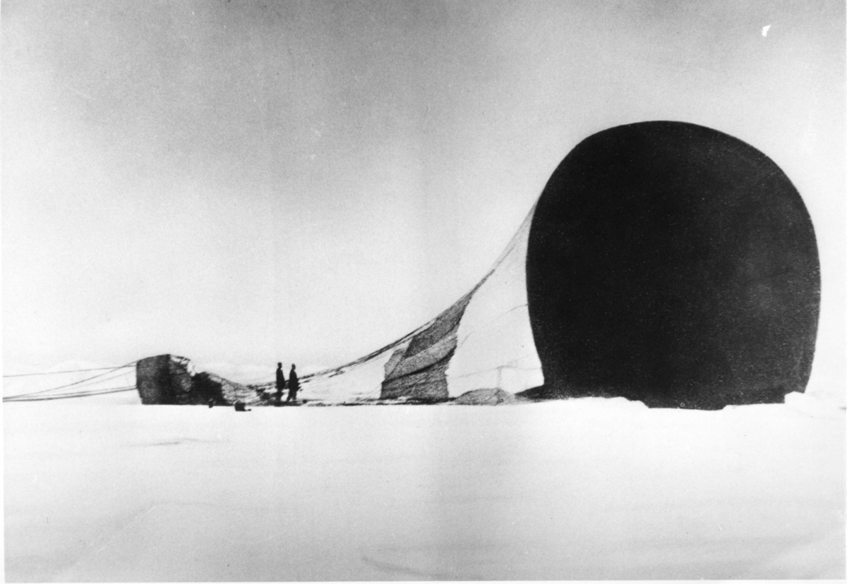 Ballongen Örnen har landat, 14 juli 1897. Troligen Nils Strindberg till vänster och S A Andrée till höger. Retuscherad version av gm.II-25. Identisk med gm.saac2.1.