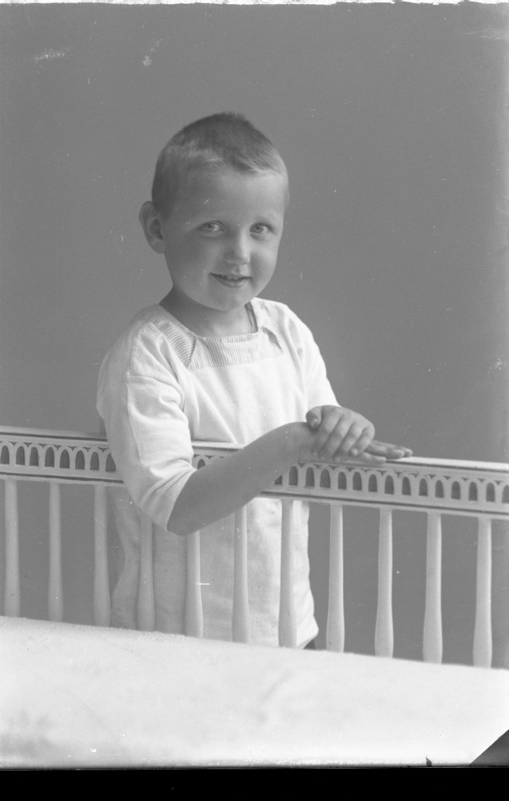 Porträtt av en liten pojke som står lutad mot ryggen på en soffa av gustaviansk stil.