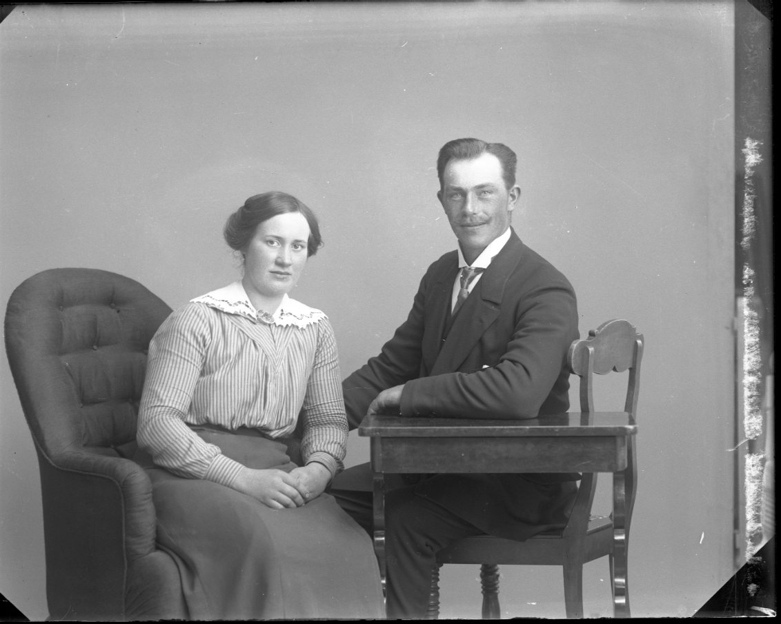Porträtt av en kvinna och en man som sitter vid ett bord. Mannen ler.