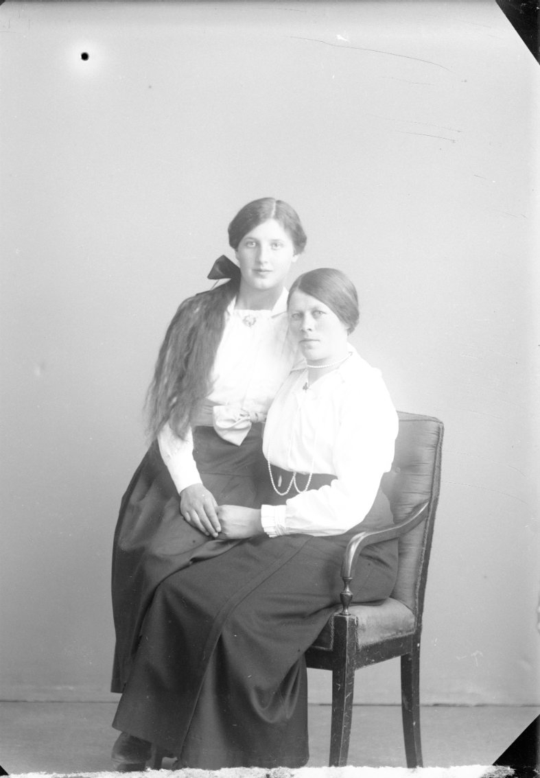 En flicka med långt hår sitter på en stols armstöd, intill en kvinna som sitter på stolen. Troligen mor och dotter.