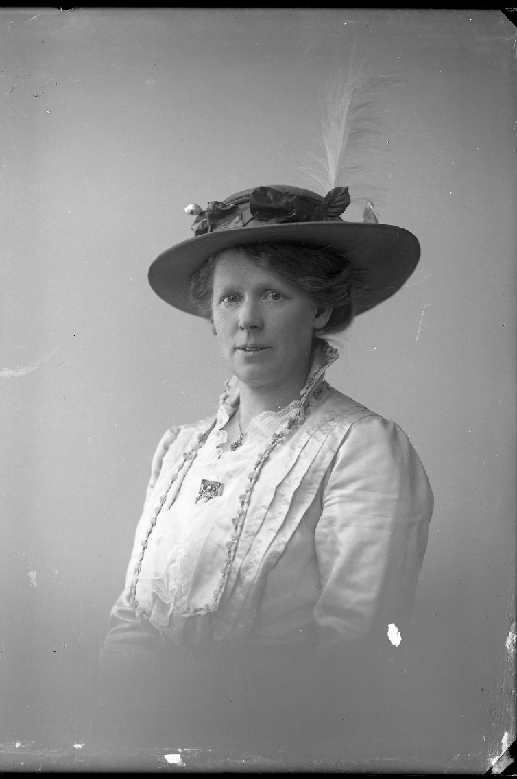 Porträtt av en ung kvinna med hatt med blad och fjäder i.