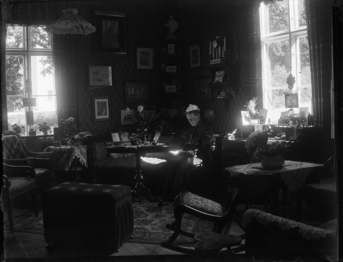 Interiör hos Fanny von Otter, som sitter i en soffa vid ett bord. Hon är i rummet mot nordost, mot kyrkan.