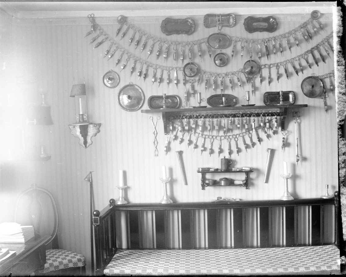 En hemmiljö. Ett stort antal ljussaxar hänger i bågformar på en vägg ovanför en soffa med rutigt tyg.