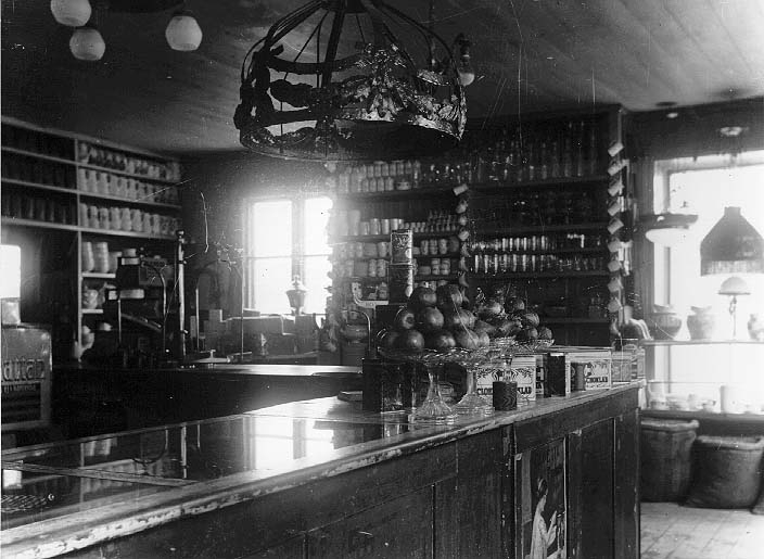 Interiör från Lennart Norstedts Speceriaffär i Gränna. En lång disk med träfront och glasad ovansida. På disken står bland annat höga glasfat med äpplen. I taket hänger flera olika armaturer av bland annat smide och plåt i form av lövranka. Vägghyllor med konserver.