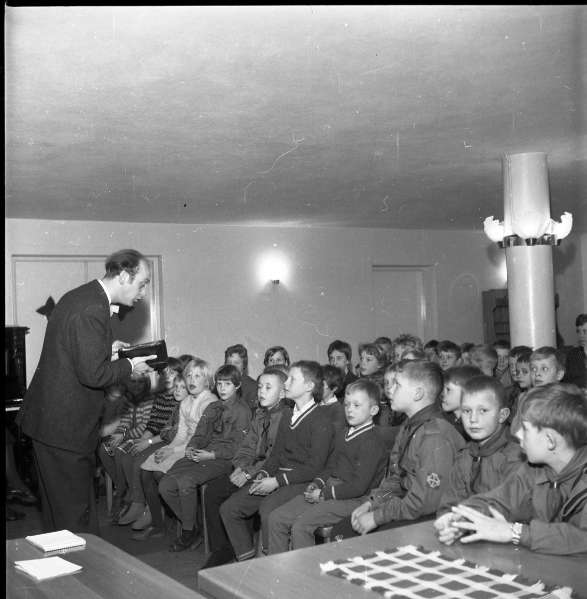 En herre står och pratar inför en grupp juniorscouter.