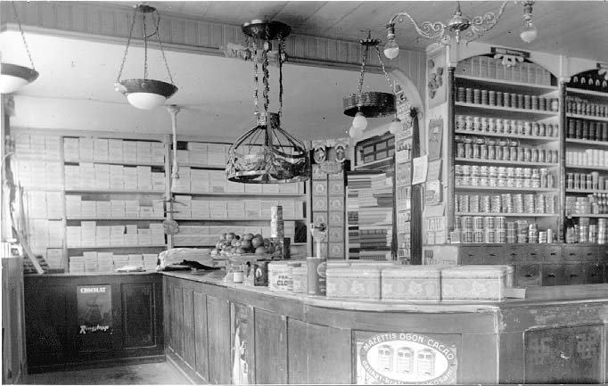 Interiör från affär. Lång butiksdisk i vinkel där det bland annat står plåtaskar och ett fat med möjligen äpplen. Vägghyllor med kartonger märkt "Skjortor", tyger samt konservburkar med okänt innehåll. Flera olika taklampor.