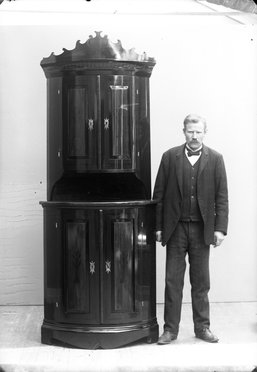 Snickarmästaren Anders Johansson i Måleskog, Gränna sn, intill ett skänkskåp. Sannolikt tillverkat av honom själv