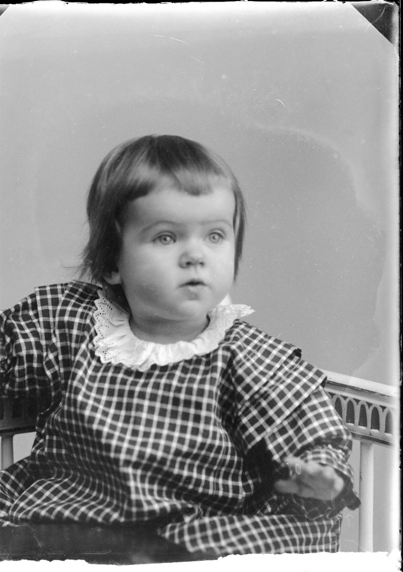 Porträtt av en liten flicka i rutig klänning med vit krage som sitter i en soffa.